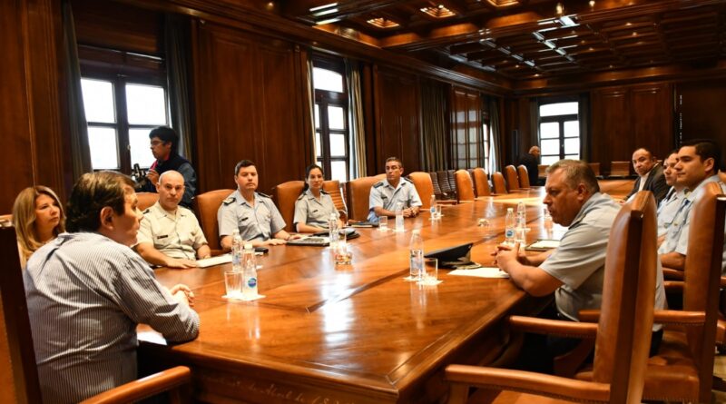 Junto al mandatario estuvieron la Ministra de Justicia y Derechos Humanos, Matilde O´Mill y el Jefe de Policía de la provincia, Roger Coronel, quienes recibieron al Comodoro Gabriel Otero; al Vice Comodoro Javier Stafulki; a los Mayores Andrés Els y Enzo Velardez; a los Capitanes Martín Díaz y Florencia Díaz y a los Suboficiales Principales María José Gigena y Sergio Ochoa.
