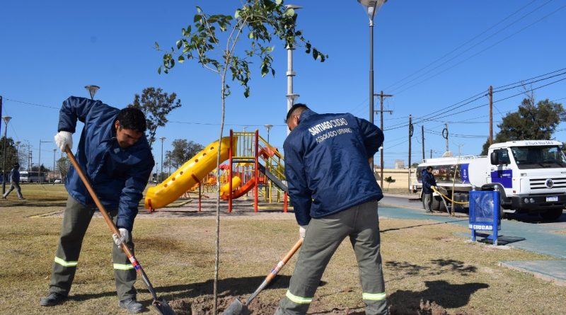En tanto, también continúa con el arbolado en otros sectores de la “Madre de ciudades”, como es el caso del barrio Industria, donde lleva a cabo la reforestación en todo el complejo habitacional.