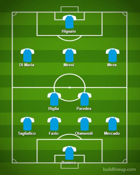 Los 11: Sergio Romero; Gabriel Mercado, Nicolás Otamendi, Federico Fazio, Nicolás Tagliafico; Leandro Paredes, Lucas Biglia; Maximiliano Meza, Lionel Messi, Ángel Di María; Gonzalo Higuaín.