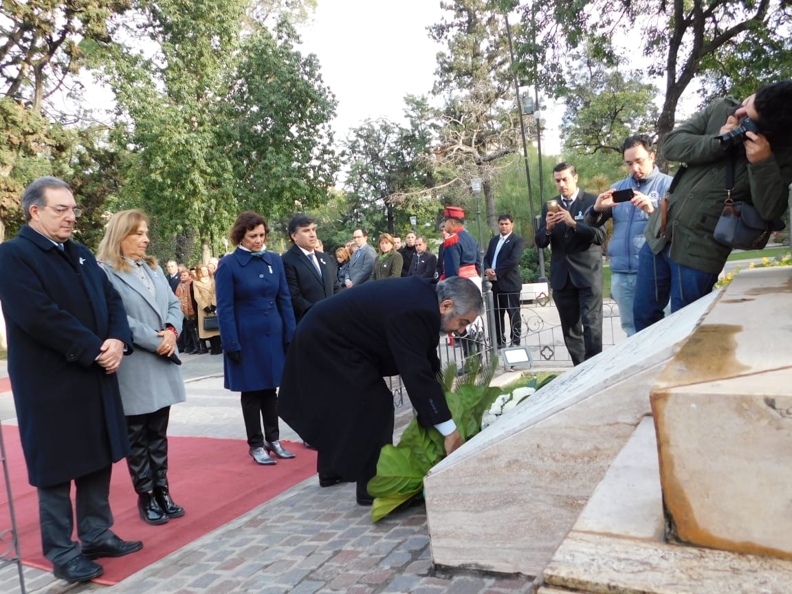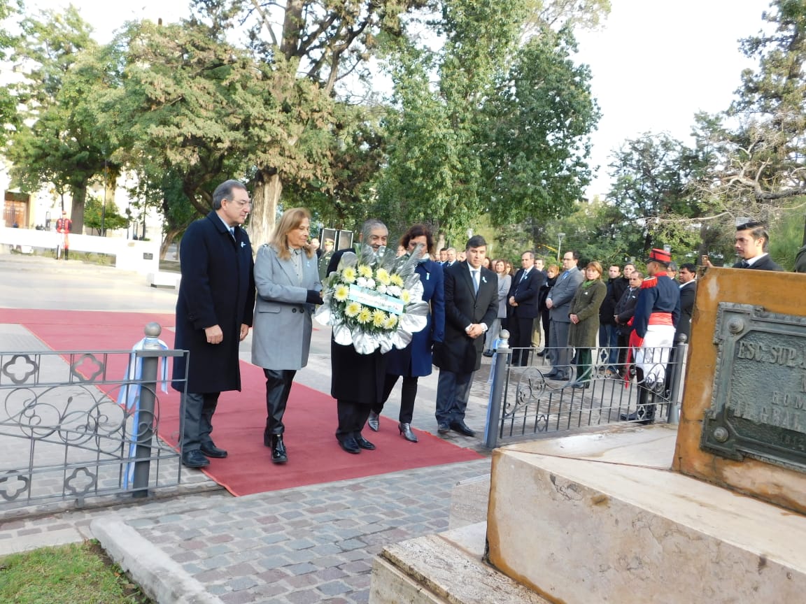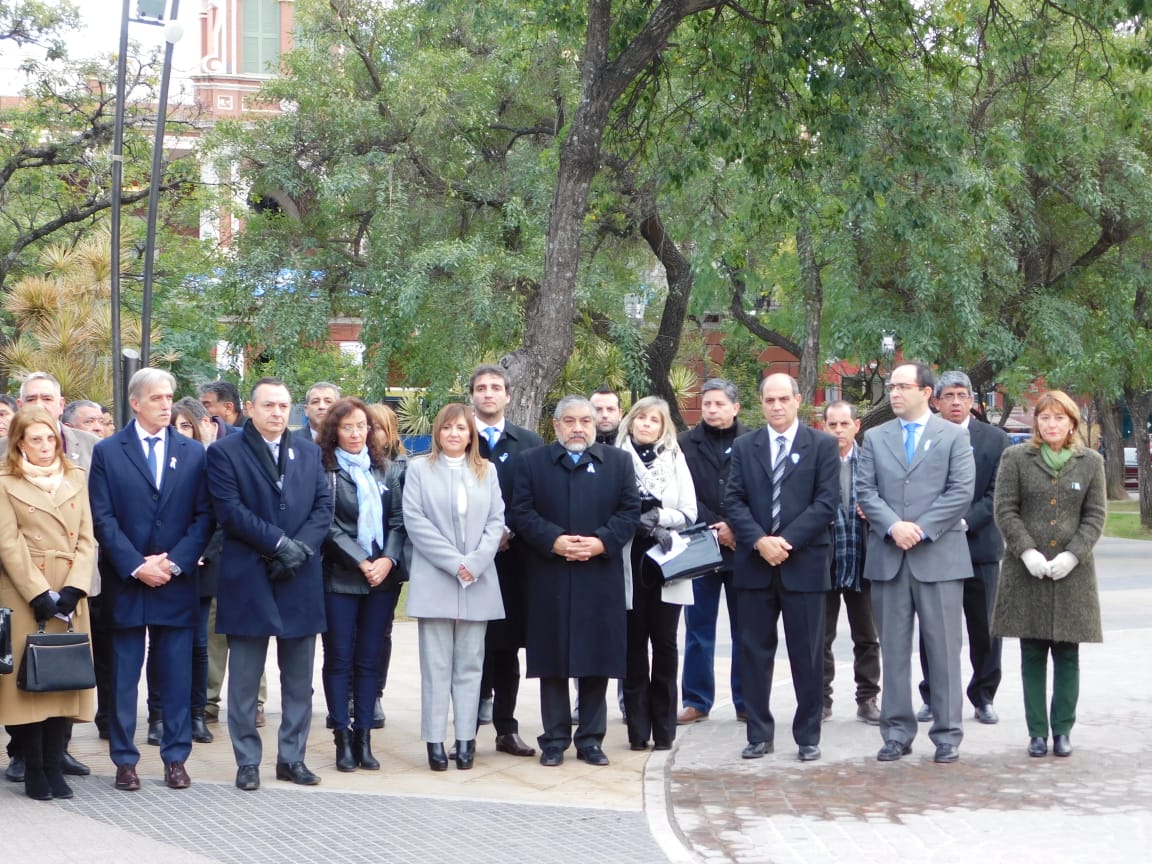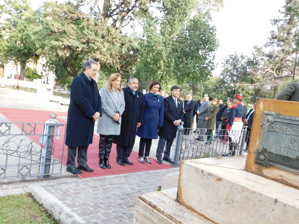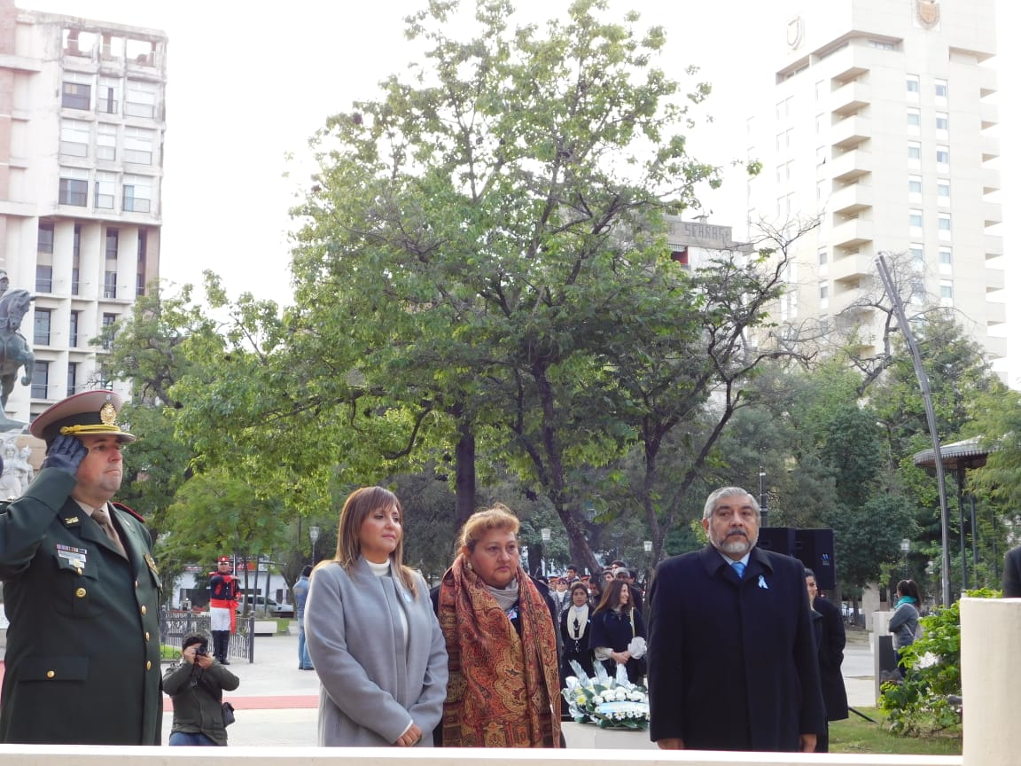La entrega de ofrendas florales se realizó de la mano de la intendente Fuentes, Humberto Santillán y personal del Instituo Belgraniano.