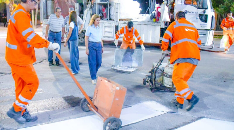 La intendente, Ing. Norma Fuentes,en la noche del lunes supervisó los trabajos de demarcación de sendas peatonales y líneas de frenado, que comprenden más de 200 esquinas de la ciudad.