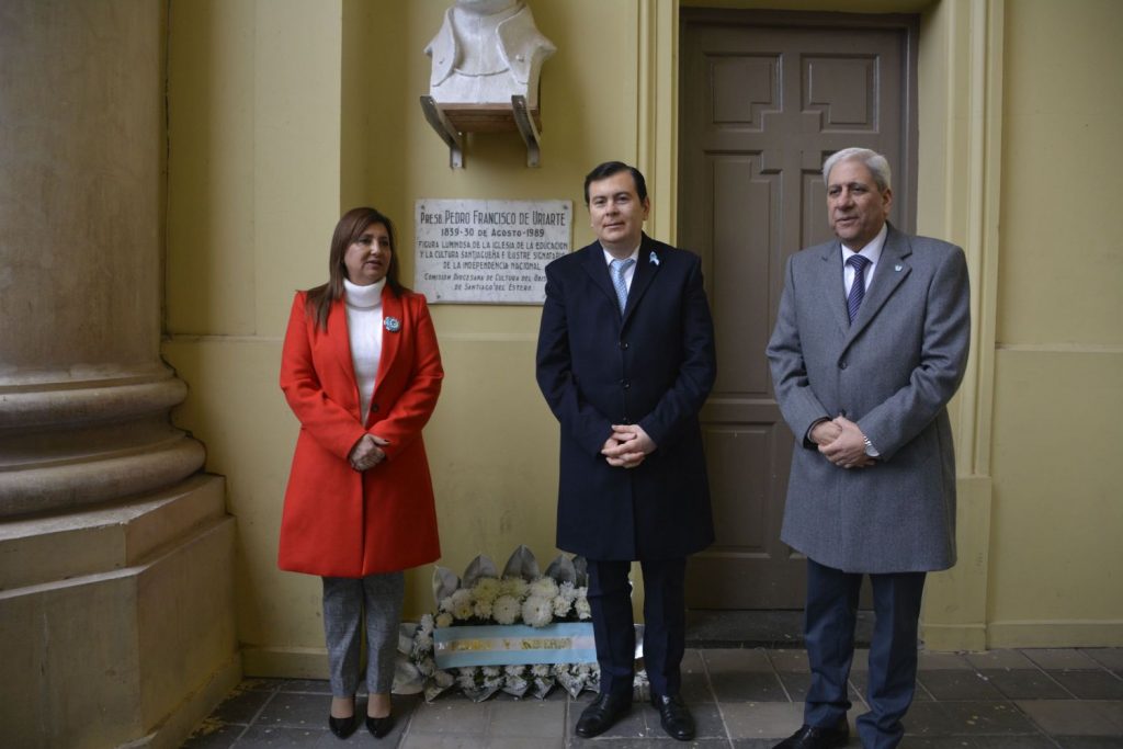 Al salir de la Catedral Basílica, el gobernador Zamora, Neder y la Ing. Norma Fuentes depositaron una ofrenda floral en el busto de Presb. Pedro Francisco de Uriarte, uno de los congresales de la provincia.