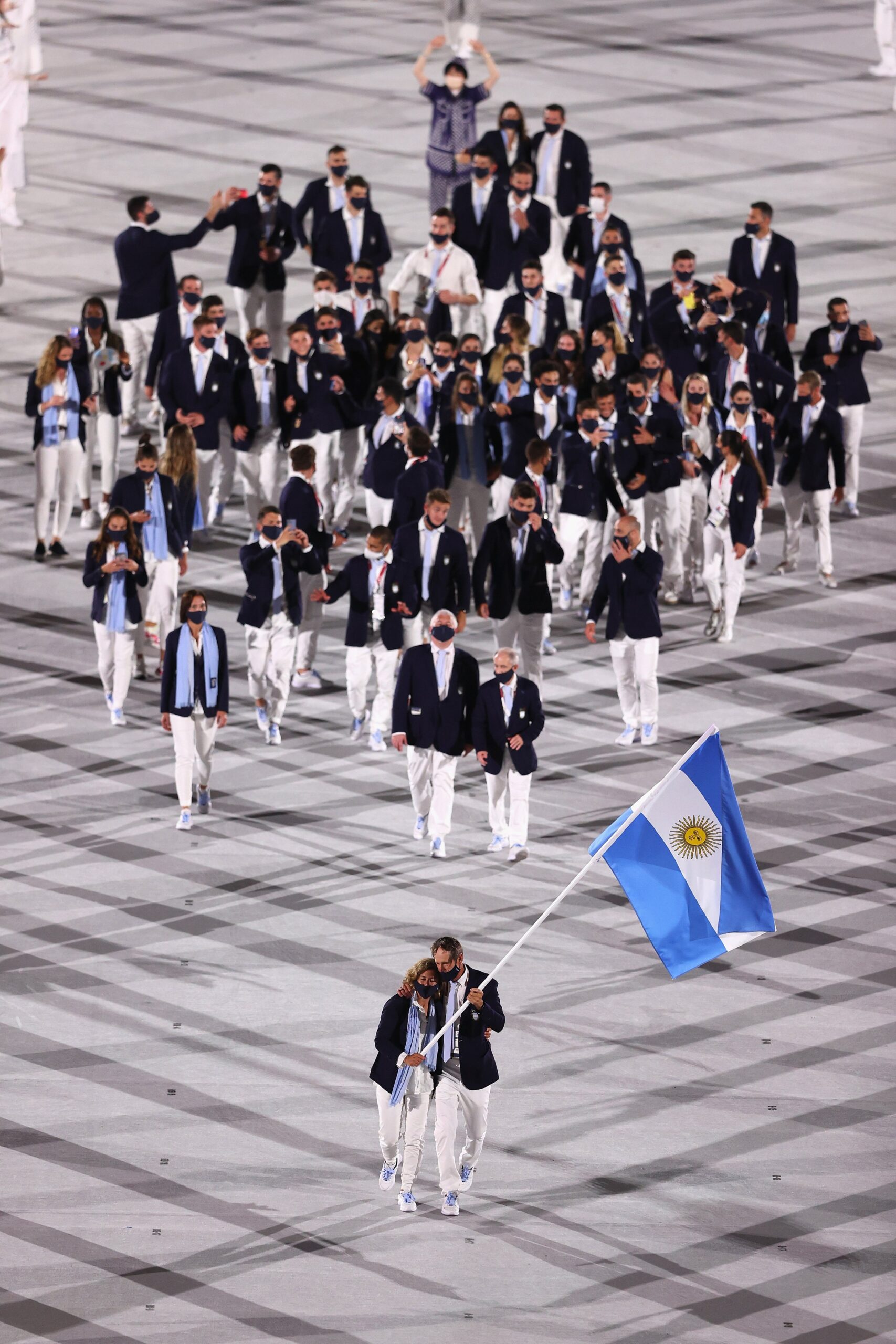 La delegación argentina, encabezada por los abanderados regatistas Santiago Lange y Cecilia Carranza Saroli quienes ganaron la presea dorada en Vela en Rio de Janeiro 2016, desfilo hoy en el noveno lugar a las 8.45, en el Estadio Nacional de Tokio en el marco de la ceremonia Inaugural de los Juegos Olímpicos de Tokio 2020, acto que se realiza sin público a causa de las medidas de seguridad sanitaria impuestas por la pandemia de coronavirus.
