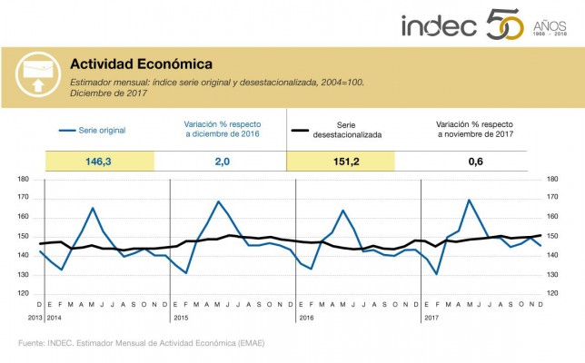 La economía se expandió un 2,8% en el 2017, la mayor tasa desde el 2011, mostró hoy el Estimador Mensual de Actividad Económica (EMAE) que elabora el Instituto Nacional de Estadística y Censos (Indec), y el Gobierno nacional dijo que prevé un desempeño aún mejor este año, en torno al 3,5%