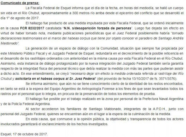 En un comunicado oficial la Fiscalía Federal de Esquel informó que «aún no se tiene conocimiento cierto de la identidad de los restos encontrados» y que al sector «accedieron los familiares de Santiago Maldonado, integrantes de la APDH junto con personal del Juzgado Federal».