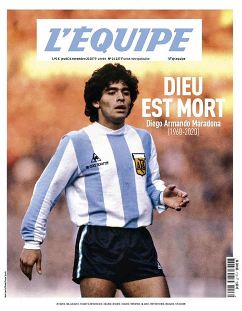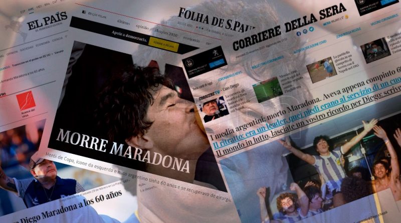Los titulares «muere leyenda del futbol mundial» o «el mundo llora a Maradona» se repiten en español, italiano, inglés, francés, alemán y las demás lenguas del planeta, ya que la noticia es presentada en los medios de todo el mundo.