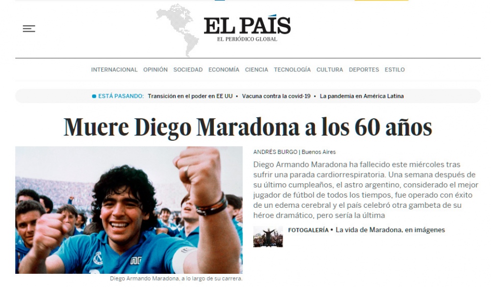 El diario El País de Madrid se hace eco de la noticia y publica la confirmación de la familia sobre la muerte de Diego. El medio recuerda el deterioro de salud que mostró el DT de Gimnasia en su última aparición pública. «Los inmortales también sufren», dice la nota.