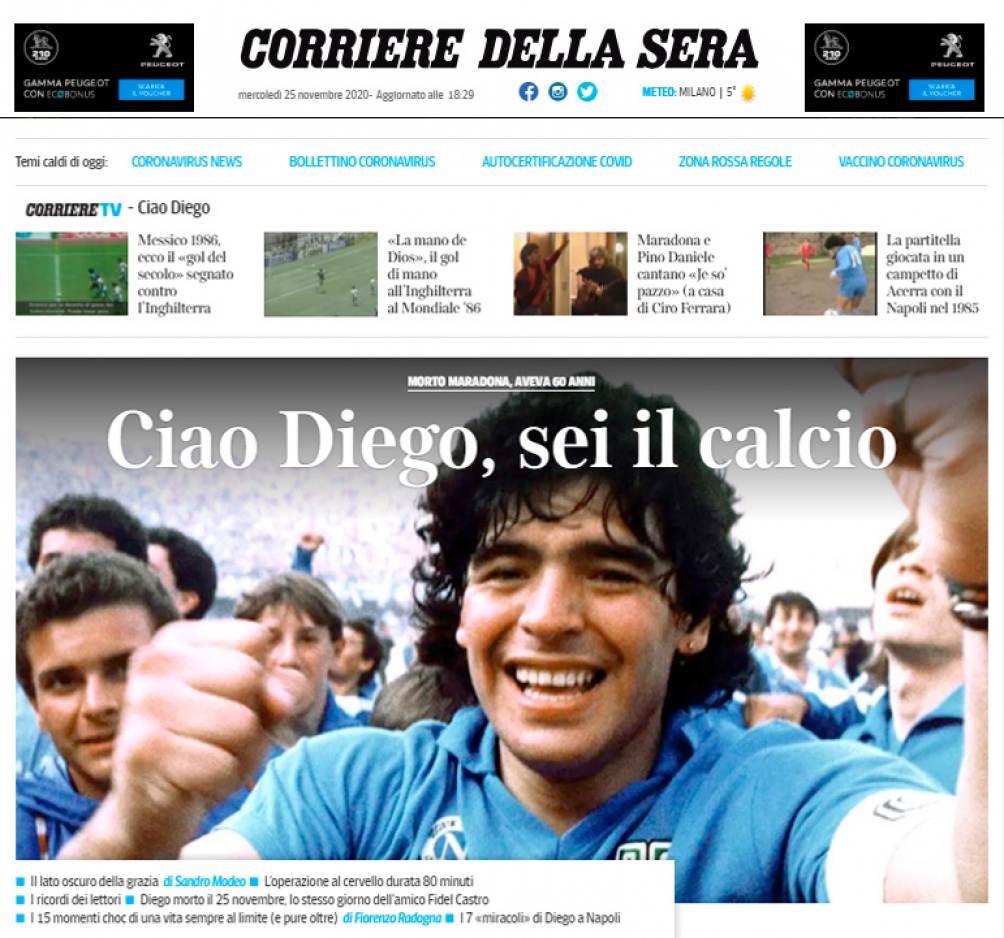 El italiano Corriere della Sera dedica toda su portada para despedir al 10. «Sus pies estaban al servicio de un gran corazón» se titula el retrato del ídolo. «No. Maradona no puede haber muerto, porque él es la esencia del fútbol y el amor no muere más», asegura en una columna de opinión el escritor napolitano Maurizio de Giovanni, quien supo disfrutar de las gambetas de Diego en el equipo de su ciudad natal.