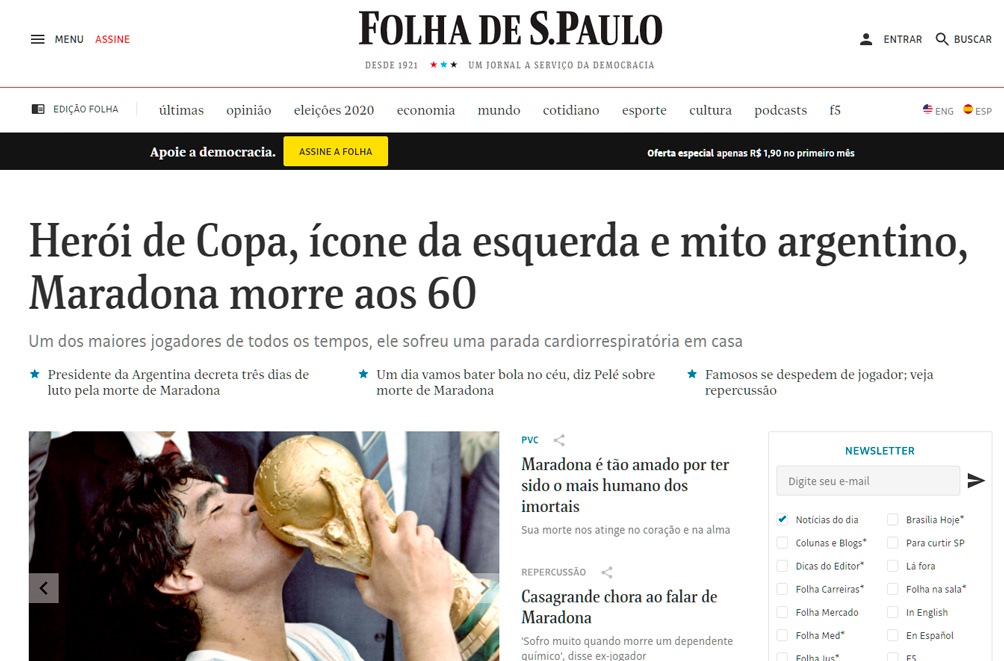El periódico brasileño Folha de Sao Paulo titula «Muere Maradona» sobre una foto del capitán de la Selección besando la Copa del Mundo en 1986 y define al ex capitán de la celeste y blanca como «Héroe de la Copa, ícono de izquierda y mito argentino».