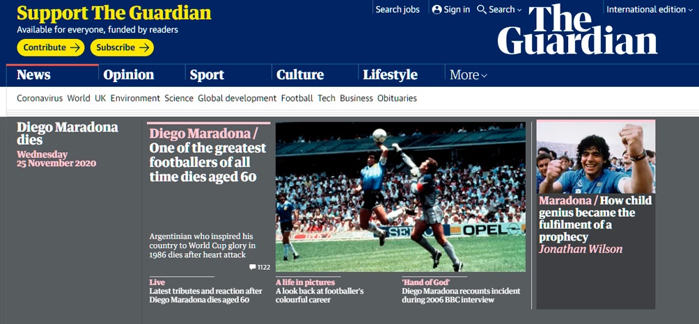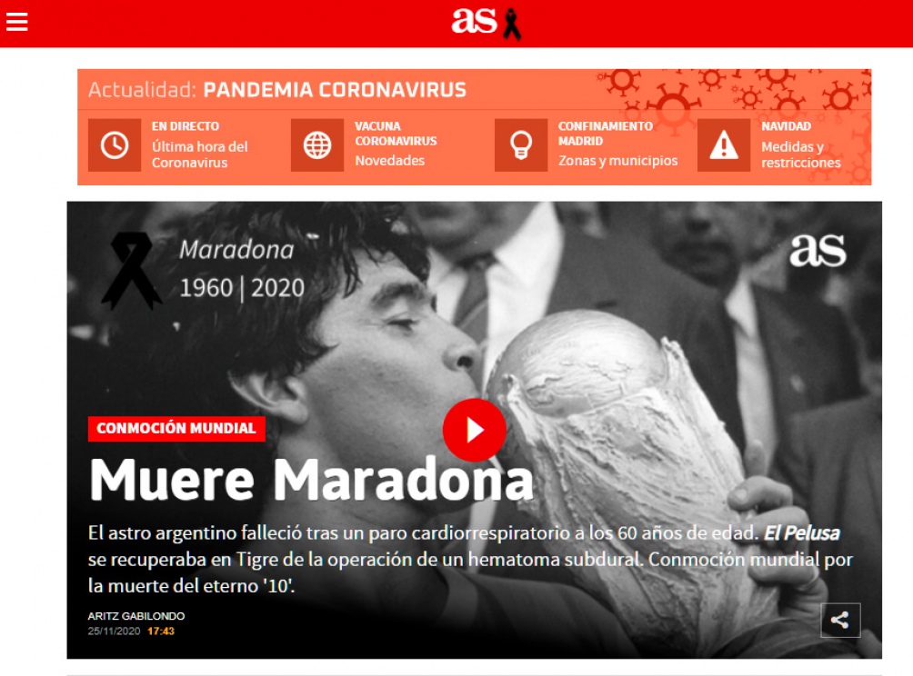 La muerte de Maradona llega a la tapa de todos los medios digitales del mundo