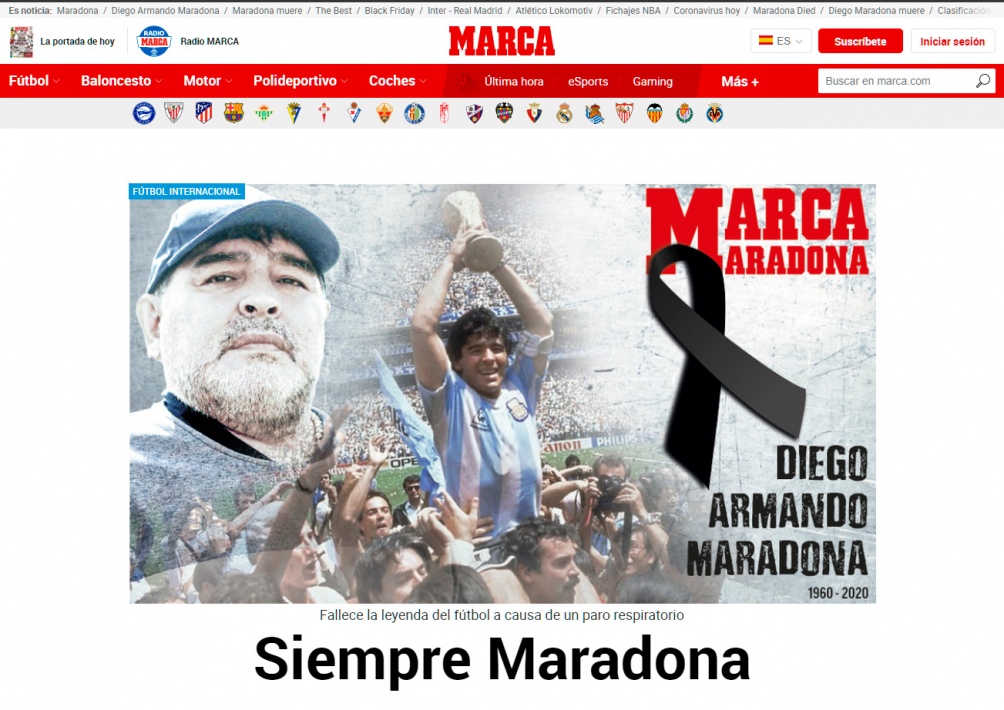 «Muere Diego Maradona. El día más triste de la historia del fútbol argentino», titula el diario deportivo español Marca, que recorre la noticia del deceso del Diez, pero también las expresiones de tristeza de jugadores argentinos como Diego Latorre y europeos como Iker Casillas y Gary Lineker.