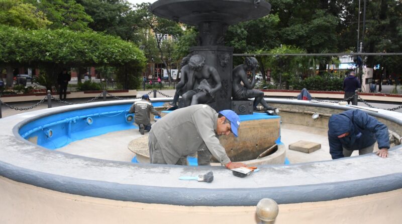 El personal de Parques y Paseos realiza la restauración y soldadura de piezas de fundición que fueron dañadas por actos de vandalismo a las figuras que ornamentan la fuente. También comprenden la limpieza general, la pintura del interior y del exterior.