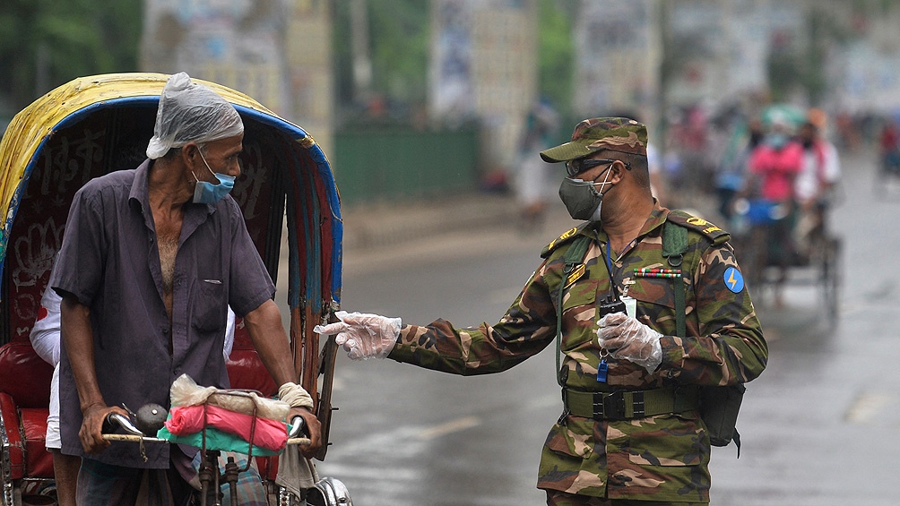 En Bangladesh, militares y policías patrullaban las calles desiertas de la capital, Daca, y otras ciudades en el primer día de un estricto confinamiento de una semana decretado en medio de un aumento de casos atribuido a la variante Delta.