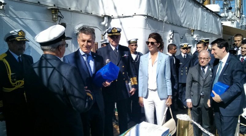Macri agradeció a la tripulación del buque escuela, que desde el 22 de junio pasado está recorriendo puertos europeos en el marco de su viaje anual de instrucción, «por habernos traído este pedacito de la Argentina en un día tan importante».