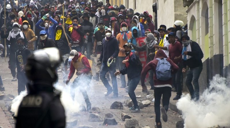 En medio de la vuelta del presidente de Ecuador, Lenín Moreno, a la capital y una nube espesa de gases lacrimógenos que inundaba las angostas calles que rodean el centro histórico, decenas de miles de indígenas, trabajadores y estudiantes profundizaron hoy sus protestas y marcharon hasta las cercanías del militarizado palacio presidencial.