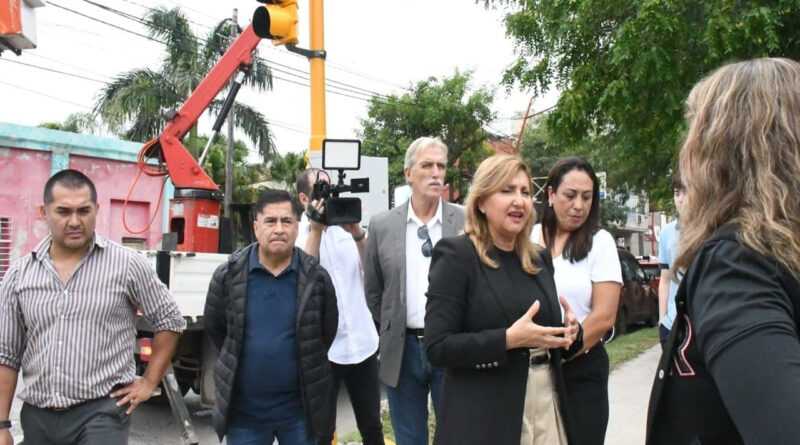 La intendente, Ing. Norma Fuentes, supervisó la instalación de nuevos semáforos en la esquina de las calles Libertad y Santa Fe, con el objetivo de mejorar la seguridad vial y optimizar la circulación del tránsito.