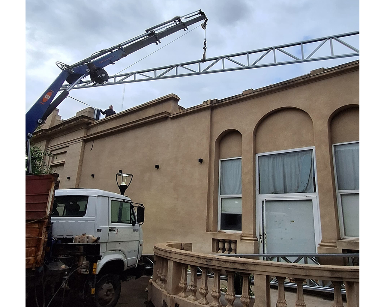 Los trabajos requirieron, por la altura de la edificación, el uso de un camión grúa que sirvió para el armado de cabriadas, el montaje de correas, anclaje y nivelación, para lograr una pendiente óptima y el apoyo de la estructura.