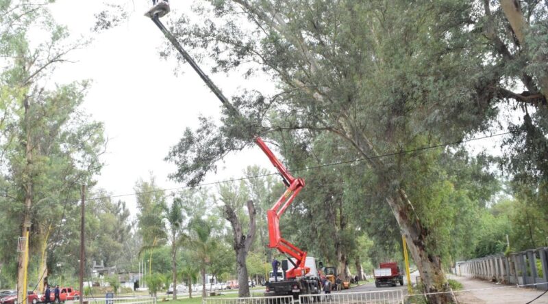 Personal municipal trabajó en la poda de un eucalipto de gran porte en la zona del Parque Aguirre, que fue afectado por los fuertes vientos y lluvias de días pasados y que provocó su inclinación.