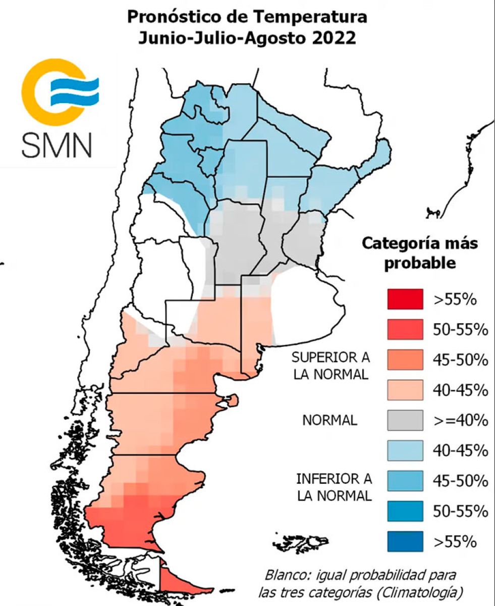 El SMN comunicó que, si bien en las provincias del NOA las temperaturas serán en promedio más bajas que las normales, hacia el norte y noreste del país habrá valores normales o inferiores a los normales. Por otro lado, en Córdoba y el sur del Litoral es posible que haya una mayor probabilidad de temperaturas dentro del promedio para la época.